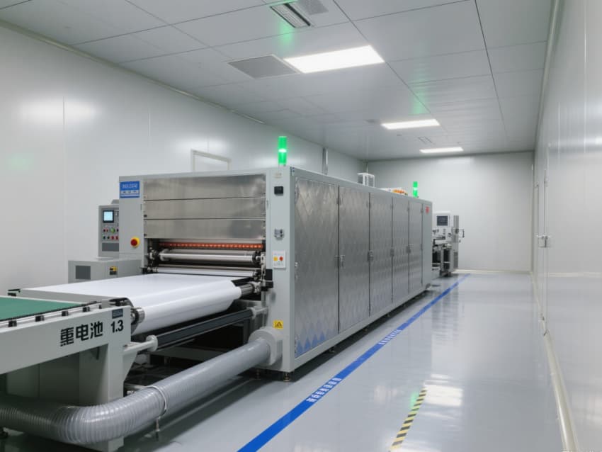 車間以銀灰色抗菌金屬彩鋼板搭建墻體與吊頂,搭配淺灰色防靜電環(huán)氧地坪,金屬質(zhì)感的建材兼具抗電解液腐蝕、易清潔特性,地面藍(lán)色防靜電標(biāo)識線清晰劃分涂布、卷繞、裝配等工序區(qū)域。頂部高效過濾器與定向?qū)恿飨到y(tǒng),實(shí)現(xiàn)每小時(shí)18-22次空氣置換,配合除濕機(jī)組將濕度精準(zhǔn)控制在20-30%RH,避免水分影響電芯性能。?
