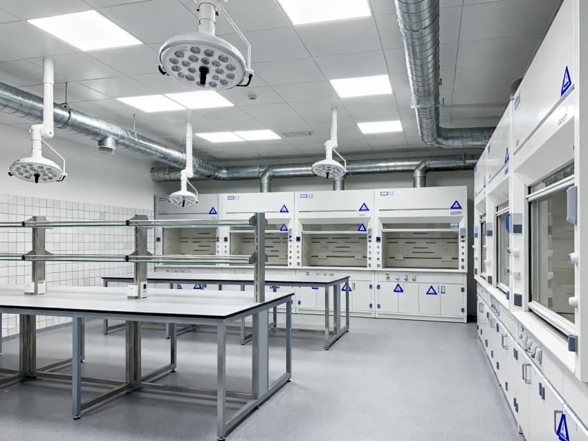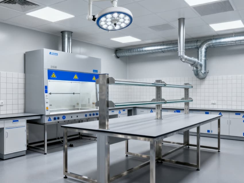 本生化研究實驗室凈化工程嚴格遵循ISO7級潔凈標準,將實驗空間科學劃分為四大核心功能區域:樣品前處理區配備通風櫥、震蕩儀等預處理設備,采用負壓設計防止交叉污染;試劑配制區設有獨立的天平室與超純水系統,通過溫濕度智能調控系統將環境參數穩定控制在±1℃與45%-60%RH;精密檢測區配置防震臺與電磁屏蔽裝置,可滿足高效液相色譜、質譜儀等精密儀器的運行需求;無菌操作區配備層流凈化工作臺與生物安全柜,配合動態浮游菌監測系統,確保實驗環境達到百級潔凈度標準。各功能區通過氣密式緩沖間與機械互鎖傳遞窗形成物理隔離,構建起三級防護屏障。在保障蛋白質分離純化、核酸提取擴增等常規實驗高效開展的同時,還專門設計了酶活性檢測專用恒溫恒濕實驗室,采用獨立的凈化空調系統與UPS不間斷電源,可支持對環境參數高度敏感的高精度研究項目。此外,工程特別設置雙通道應急處理系統,包含緊急洗眼裝置、消防噴淋系統與防化物資儲備間,配合逃生路線熒光標識與應急照明系統,全方位保障實驗人員安全與科研數據完整。?