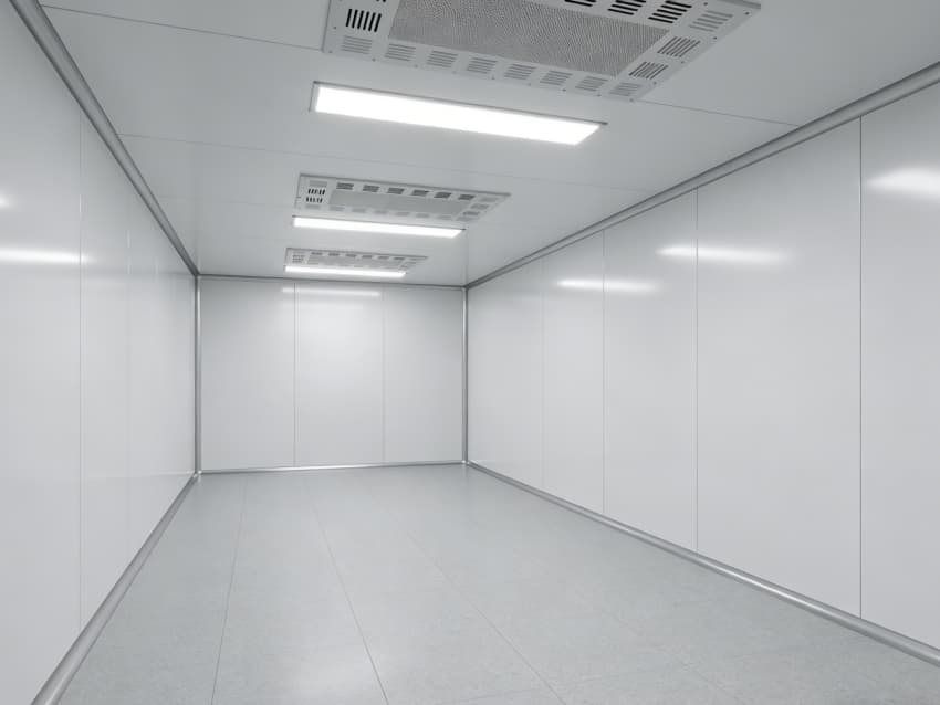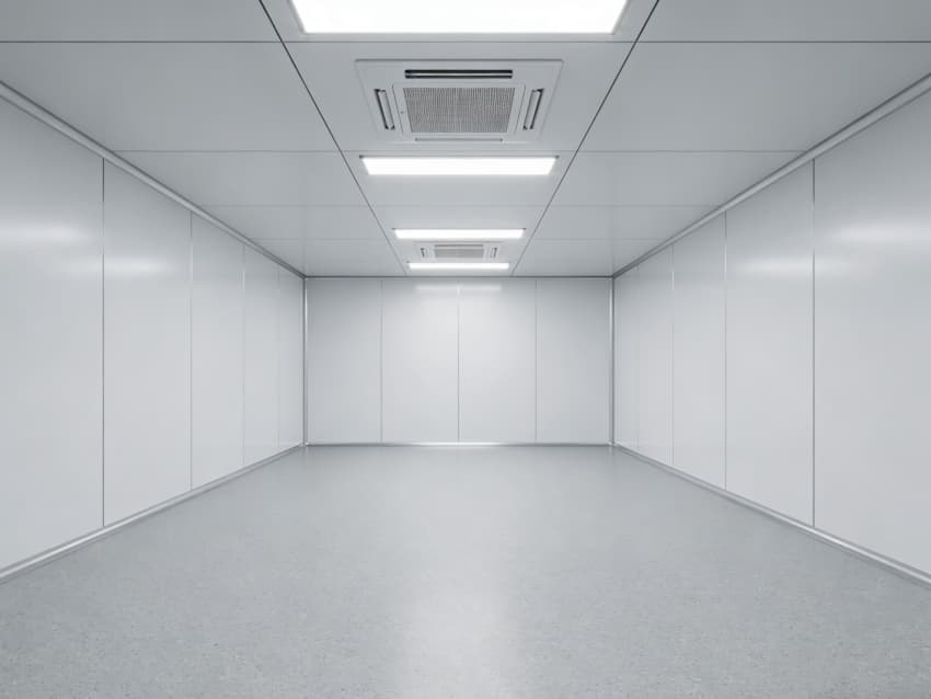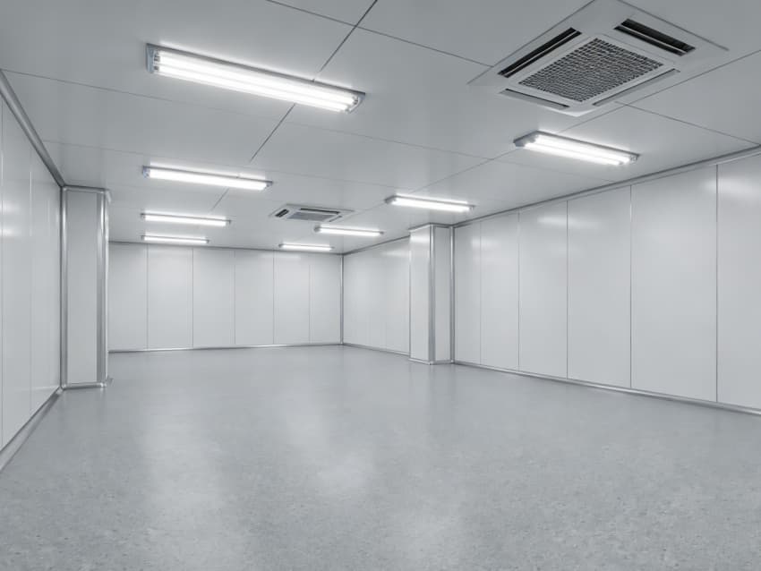 本次呈現的電子精密器件工廠車間以“高精度施工、高潔凈適配”為核心,融合多項專業施工工藝,車間內部施工工藝凸顯精密特性:地面采用淺灰色環氧防靜電自流平工藝,經基層拋丸處理、界面劑涂刷、環氧砂漿找平、自流平罩面四道核心工序,表面平整度誤差≤0.8mm/m,防靜電性能達10?-10?Ω;墻面采用白色潔凈抗菌涂層施工,推行無縫拼接技術,陰陽角采用R50圓弧倒角工藝,杜絕積塵死角,涂層硬度達2H以上,耐受頻繁清潔。