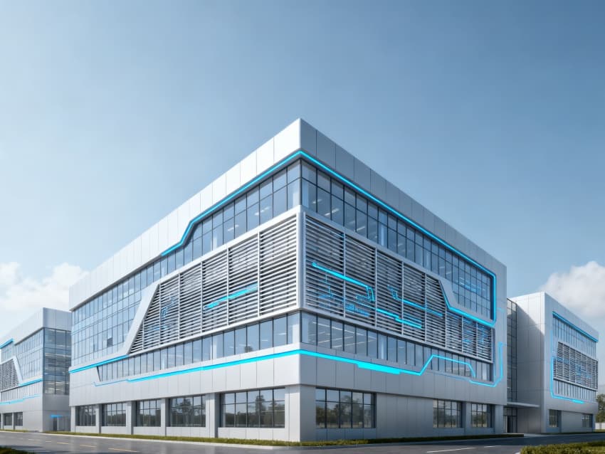 廠房外立面采用銀白啞光不銹鋼板與防眩光Low-E玻璃組合,縱向線條利落規(guī)整,主立面嵌入微縮芯片電路暗紋,既凸顯產(chǎn)業(yè)屬性又保持視覺(jué)簡(jiǎn)潔;大面積玻璃幕墻搭配智能遮陽(yáng)系統(tǒng),可調(diào)節(jié)自然光攝入,兼顧節(jié)能與車間光照穩(wěn)定性,整體呈現(xiàn)精密、冷靜的科技質(zhì)感。?